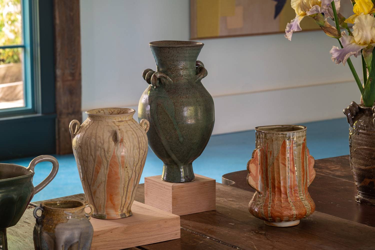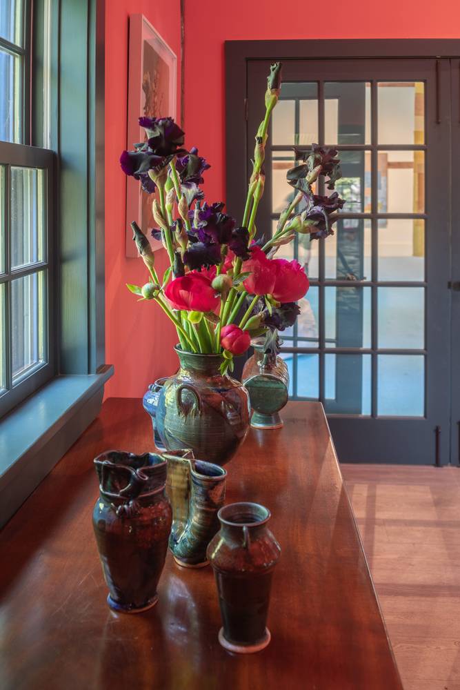 Here she works, loosely and associatively, within the venerated Japanese idiom of oribe, named for the 16th-century connoisseur Furuta Oribe, who helped to cultivate the taste for poetic rusticity that still forms the aesthetic center of the tea ceremony. The ceramic type developed under his patronage features wayward forms, embellished with landscape motifs in dark iron slip, and pools of glaze so pond-green that you half- expect a frog to jump out of them. At Madoo, Palmer’s pots are salon-hung on the walls, and also displayed on Dash’s tabletops. Her footed forms depart from Japanese precedent, instead evoking ancient Mediterranean typologies – Cycladic vessels and Roman amphorae – with a hint, here and there, of genius potter George Ohr’s ruffled wonders. Throughout the run of the show, the pieces will further enlivened with her own arrangements of flowers from the garden, helping the exhibition keep pace with the world out of doors.