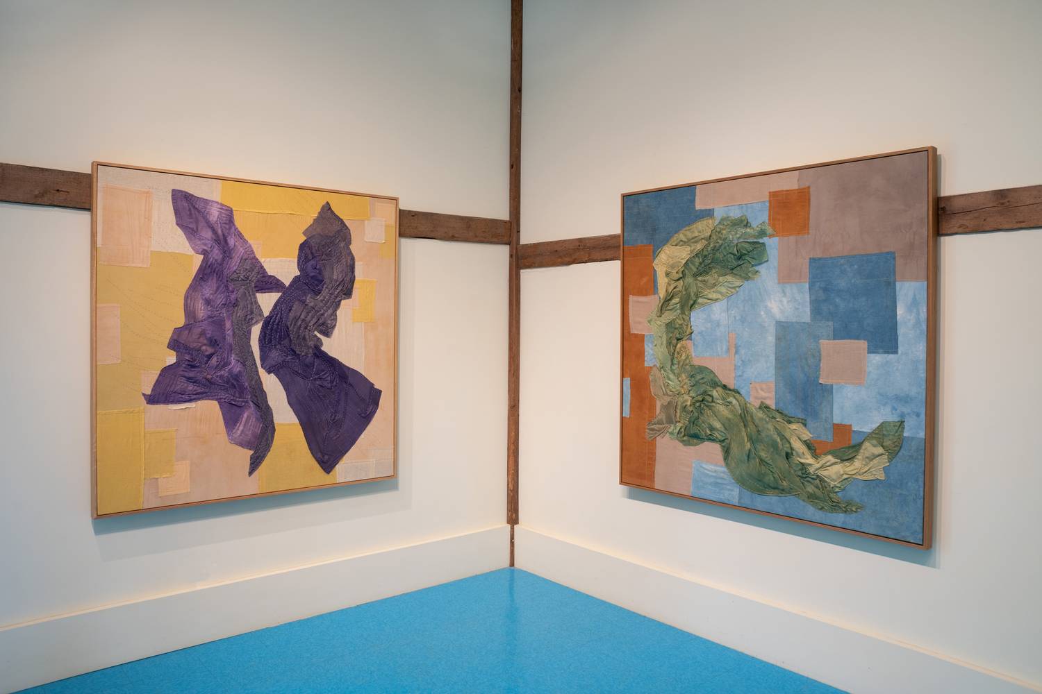 Arai contributes framed square fabric works – a painting-type format – as well as noren hung from the rafters of Dash’s ceiling. A final piece will hang in a window, capturing the Long Island light. While continuing her exploration of the boro technique (the Japanese analogue to American scrap quilting), she explores new territory, here, with the use of natural dyes and over-dyes in all of the textile pieces. The material palette is astonishingly broad – including logwood, madder, marigold, indigo and walnut, to name a few – and in some cases she has used up to ten separate color vats to get the desired effect.